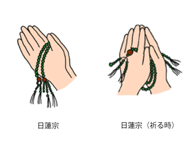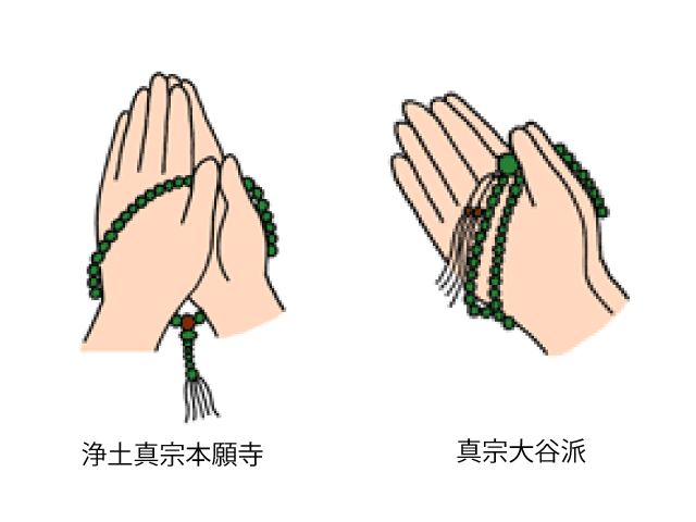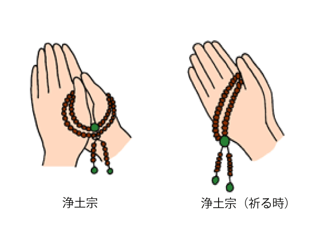※各宗派によって合掌した時の数珠のかけ方にも違いがあります。イラストをご参照ください。