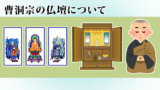 曹洞宗の場合、「一仏両祖」と言って中央に本尊、右に高祖承陽大師道元禅師、左に太祖常済大師瑩山禅師を配置して三尊仏形式として祀ります。