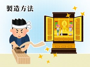 伝統工芸の匠の技を結集してつくられる金仏壇は、複雑な工程を経て完成に至るものです。各工程に専門的な技術をもつ職人がおり、作業を分担しています。ここからは、金仏壇の製造方法とそれぞれの職人が行っている作業を見ていきましょう。