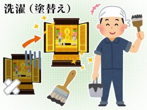 仏壇仏具店で仏壇の修復やクリーニングしてもらうことを、仏壇のお洗濯と言います。洗濯では、一度仏壇を解体、洗浄した後に、木地や金具の補修、漆の塗装や金箔の貼り直しといった修復を施していきます。長年使用して痛みや汚れがあり、色が剥げてしまった仏壇でも、お洗濯することで新品のような輝きを取り戻せます。