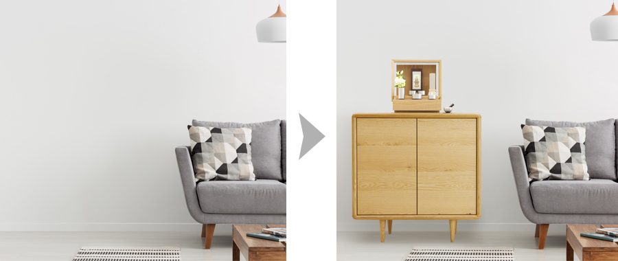 仏壇は写真1枚につき、お好きな3品まで合成可能。我が家にはどの仏壇が似合うのか、お部屋の雰囲気と合わせてみたいときにおすすめです。