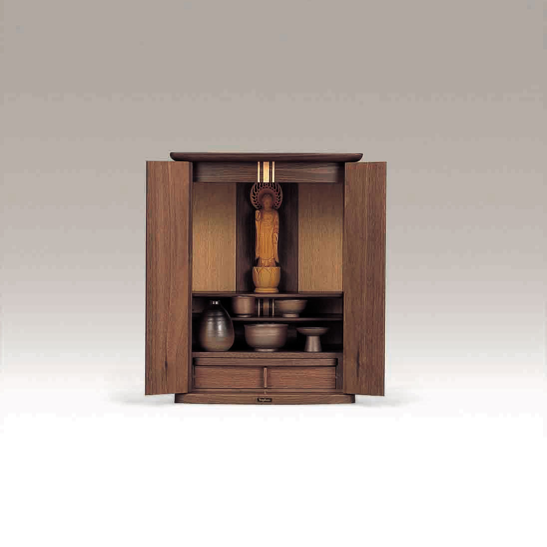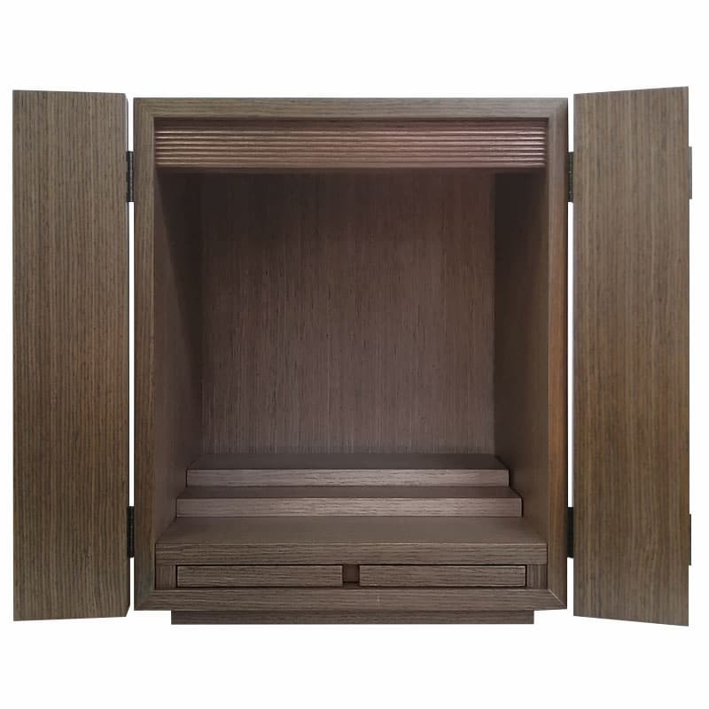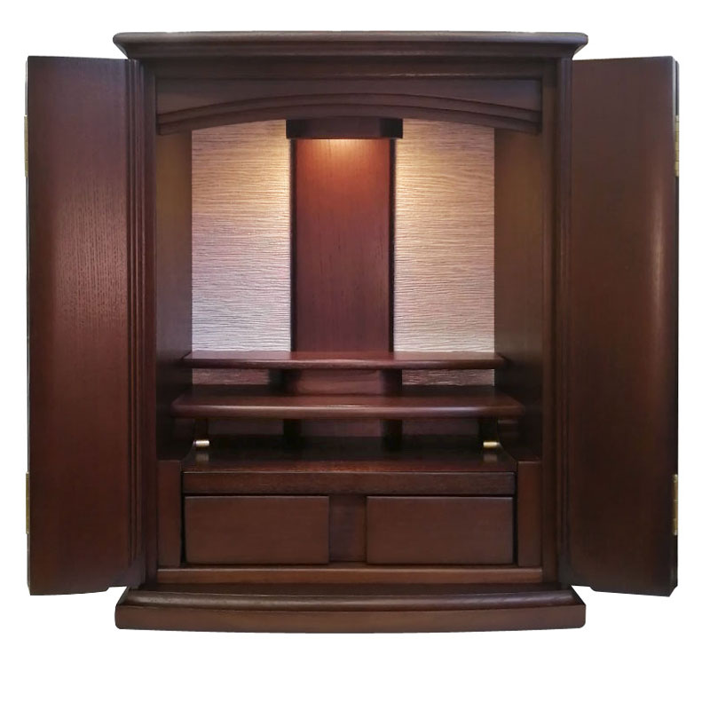 お手頃価格でコンパクトなお仏壇です。ウォールナットの落ち着いた色合いにシンプルなデザインがどのようなシーンにも合わせやすいお仏壇となっております。