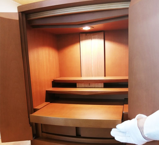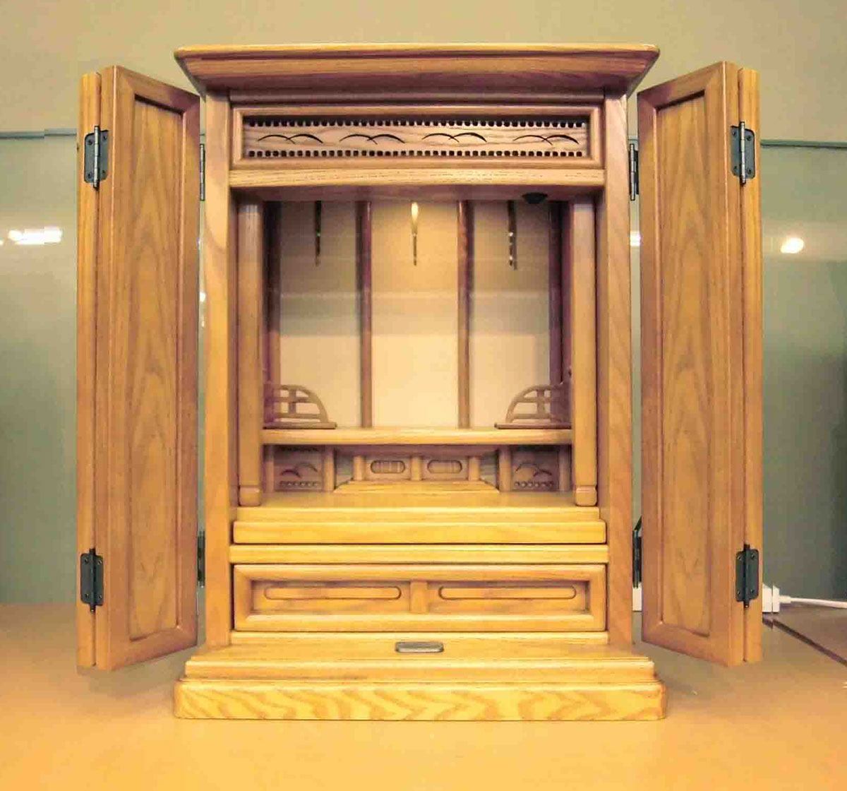 扉にはアンバー色のガラスが設置されており、ガラス扉を閉めるとうっすらと中が見え、明るい雰囲気でご安置いただけます。
