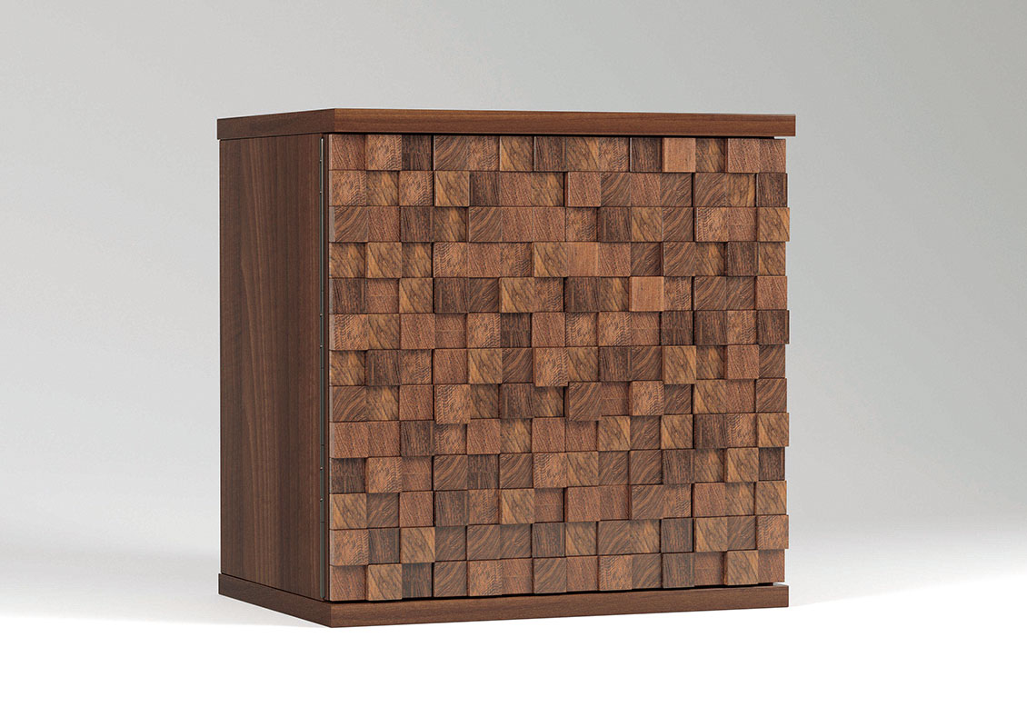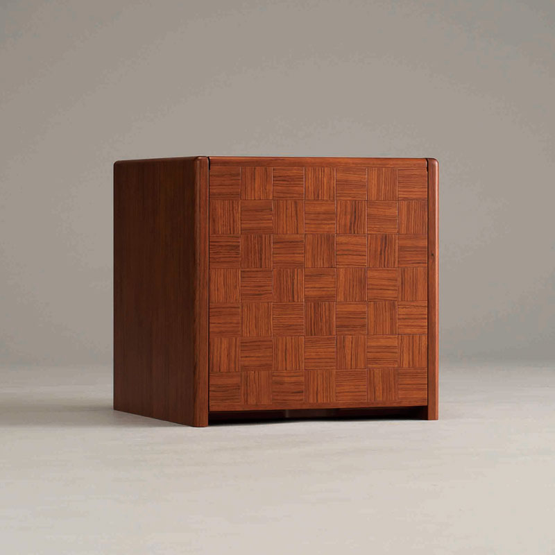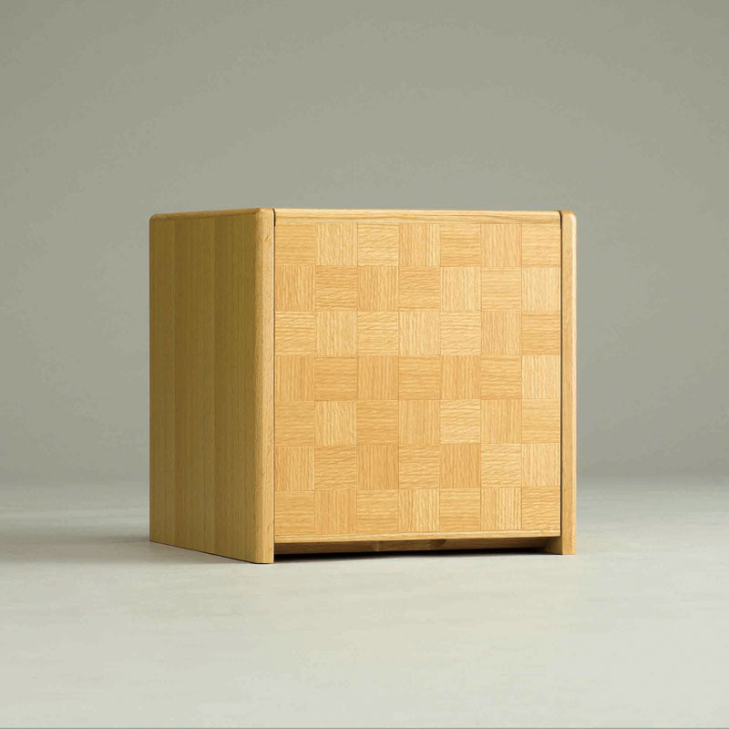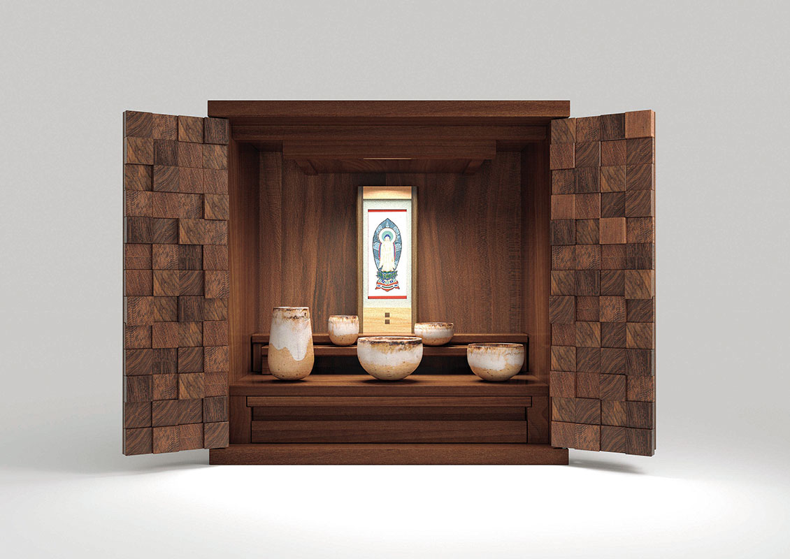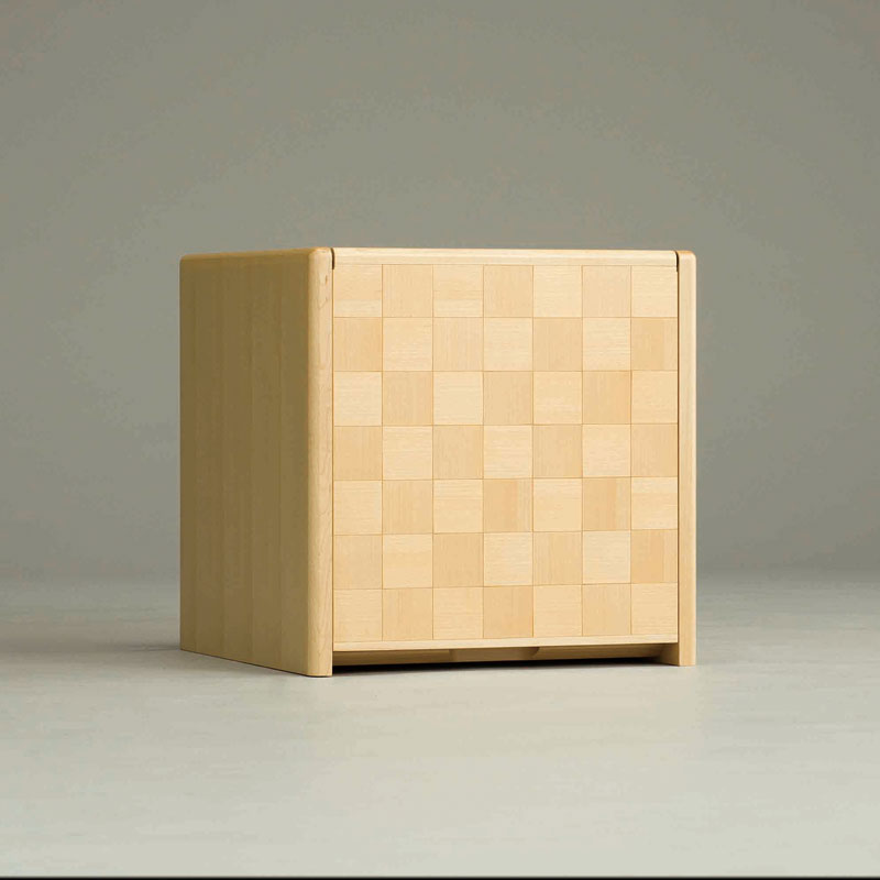 市松模様の扉は跳ね上げ式で横幅を取らないコンパクトデザイン。おしゃれなキューブ型のクラフト感あふれる仏壇です。