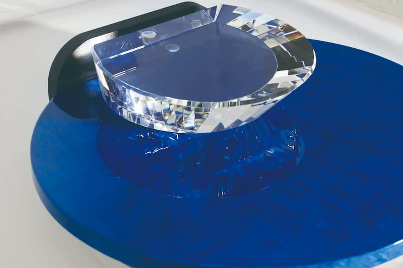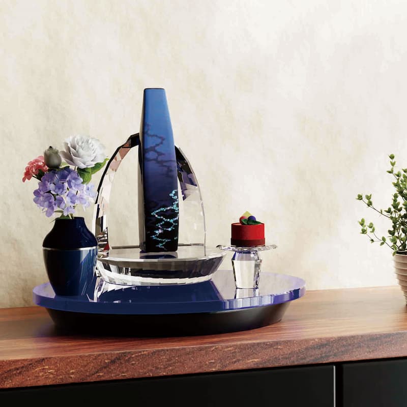 ガラスのステージが輝くおしゃれな仏壇。リビングに馴染む小さいサイズです。深く鮮やかなブルーに染まるバーズアイメープルが高級感を漂わせます。