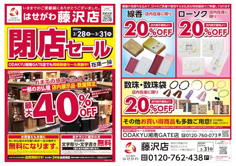 【藤沢店は、2026年3月31日(火)をもって閉店いたします】今までのご愛顧、誠にありがとうございました。これまでの感謝を込めて、3月31日(火)までの期間中、「閉店セール」を開催いたします。この機会にぜひご来店ください。
