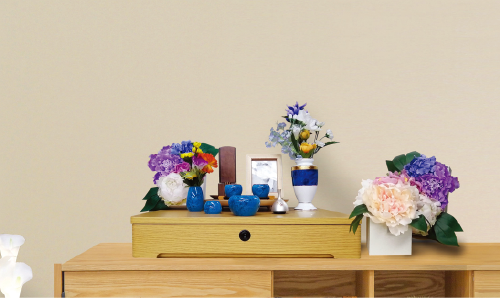 お参り壇の上に、お位牌と故人の写真でお祀りし、慰霊の場として思い出の品や花で華やかに飾ります。