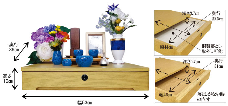 お仏壇の引き出しにご遺骨を入れて保管したいというお客様の声により誕生しました(お持ちのお仏壇の引き出しに入るか事前に寸法をご確認ください)。フラットですっきりとしたデザインですので、チェストや棚の上に置かれてもよいでしょう。