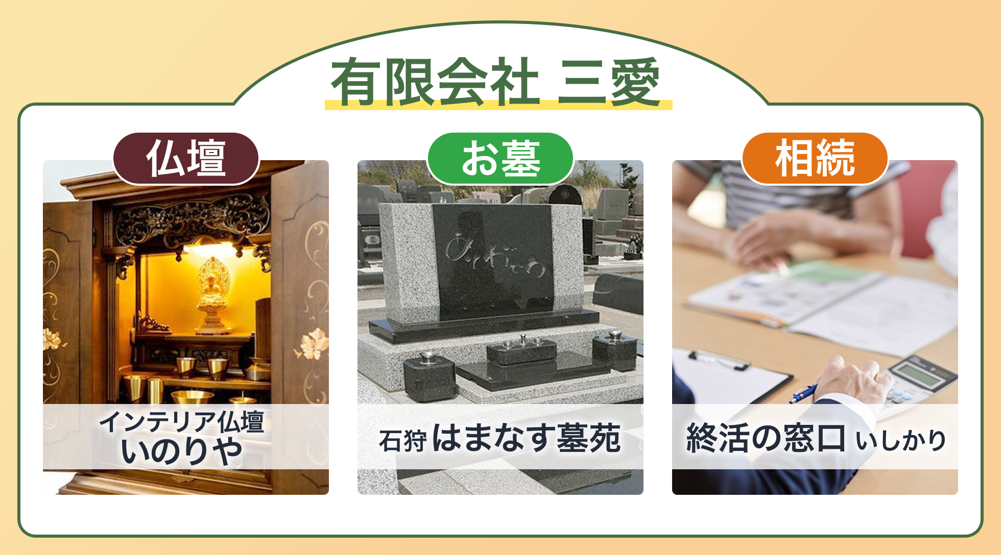 お仏壇やお墓のご購入、相続や遺言についてのご相談など、終活や仏事について、まとめて依頼できると安心で便利ですよね。「三愛」は、終活・仏事の相談について、トータルで受け付けています。仏壇・お墓・相続・遺言などのご相談は「三愛」にお任せください。