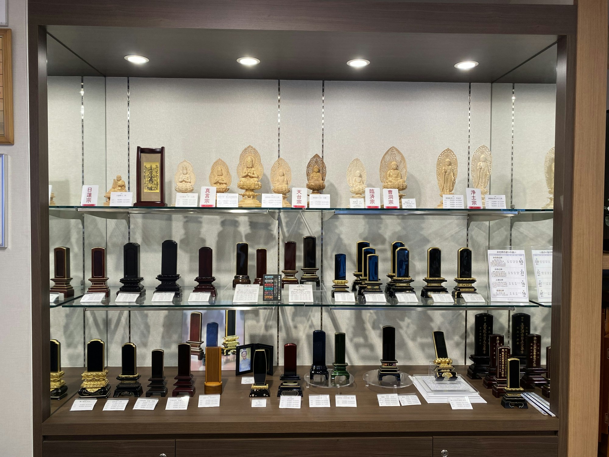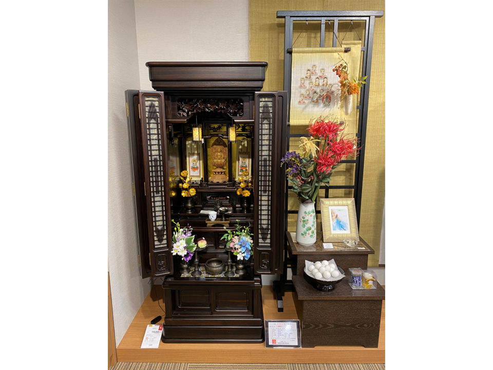 はせがわ上高井戸店では、オリジナルの仏壇・仏具を中心に、都市型タイプから黒壇や紫檀などの銘木を使用した伝統型まで、多彩なお仏壇を展示しています。上置型・伝統型・コンパクトな都市型と、タイプ別に商品を配置し、お客様が見やすい、分かりやすいディスプレイを徹底しているそうです。さらに各宗派別のお飾りをした仏壇も展示しているのも、同店の大きな特徴です。ご自宅の飾り方が間違っていないか確認することができ、ご自宅に合う仏壇・仏具をスムーズに選ぶことができます。