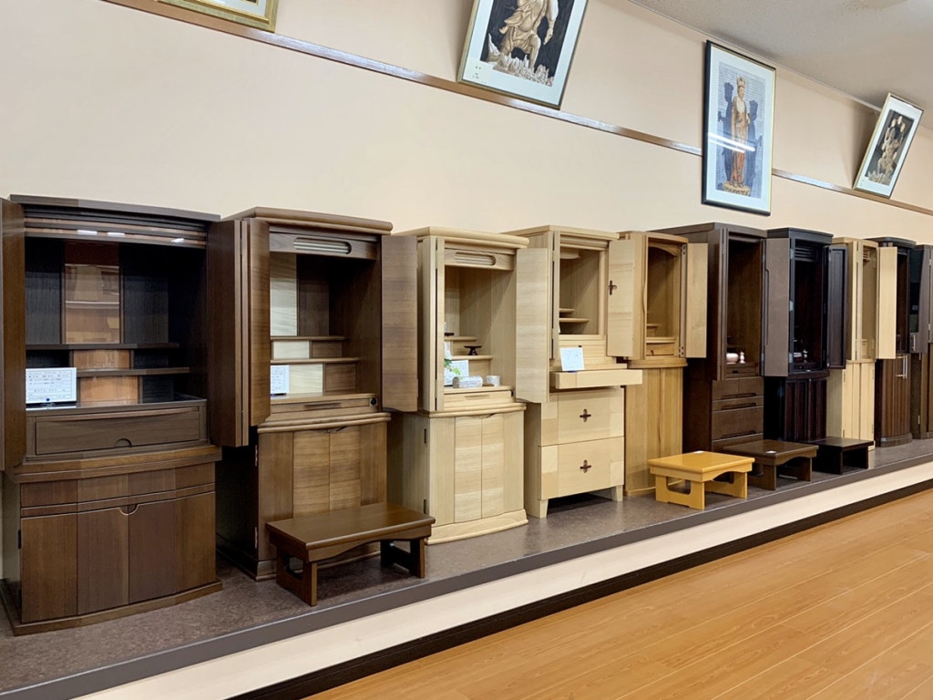 1階の展示場には、モダン仏壇を中心に50基ほど展示されています。色違いやサイズ違いは倉庫にて保管し、お客様よりご要望を頂き次第店舗に納品し、お客様にすぐ見て頂けるよう心掛けているとのこと。