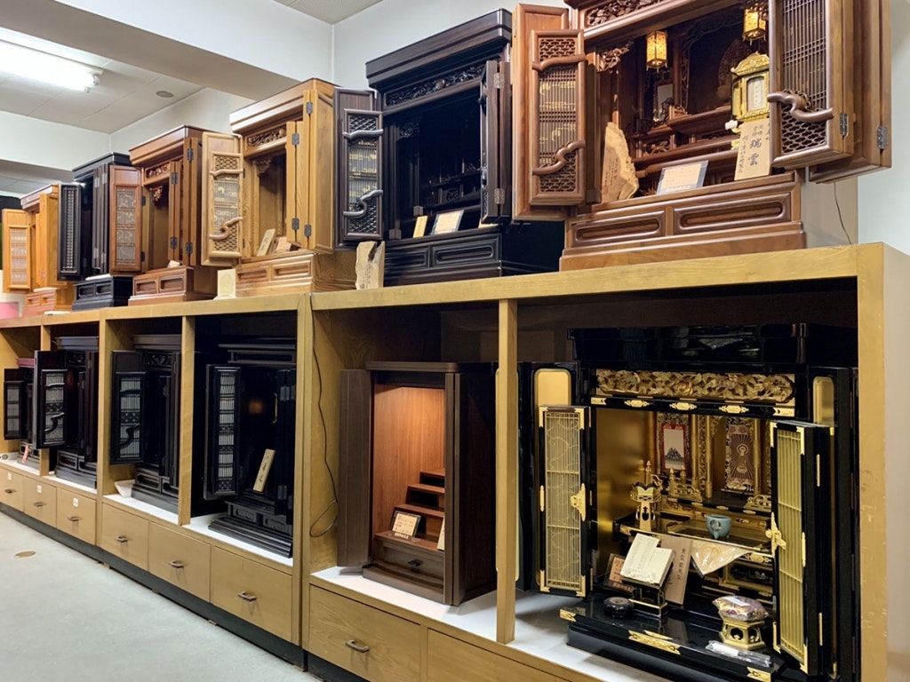 同店最大の魅力は千葉県で最大級の仏壇の品揃えです。約80台の唐木仏壇、約100台の家具調仏壇、数百万を超える高級な伝統産業仏壇も多数取り揃えております。一千万円を超える仏壇もございます。