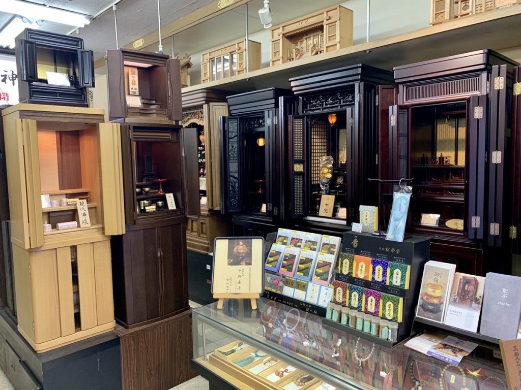仏壇・仏具のほか、お線香やろうそく、仏具のバラ売り、経本に至るまで、他店舗にはあまり置かれていないような仏具も豊富に展示しています。
