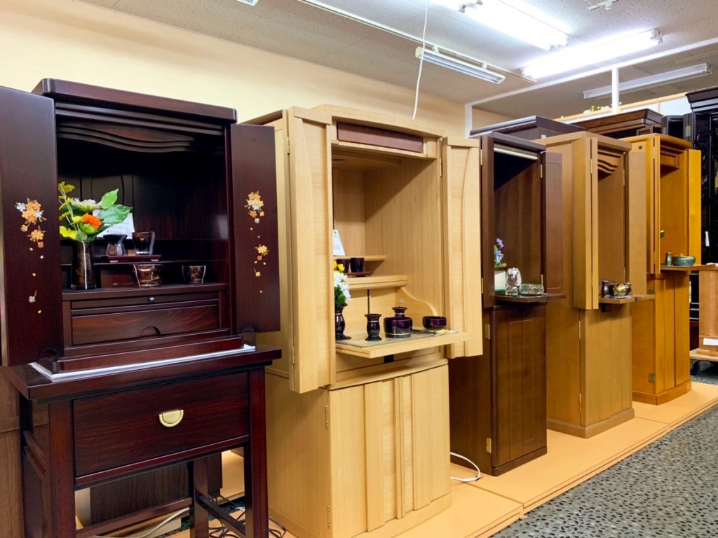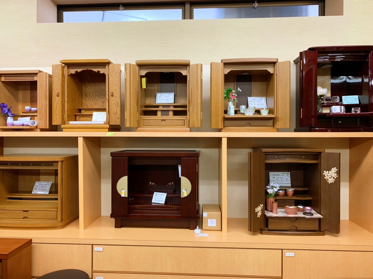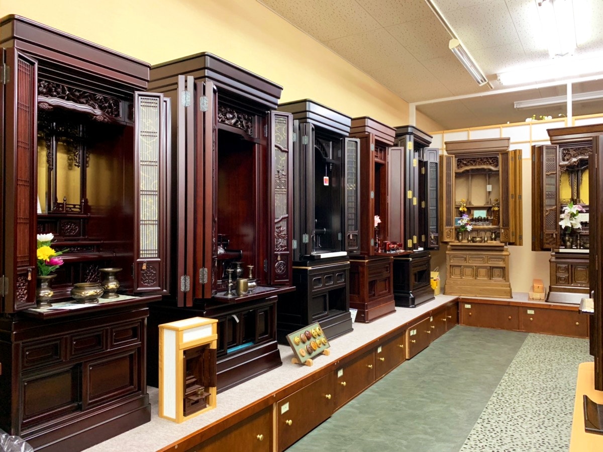 お仏壇の展示される「お仏壇ぎゃらりぃ」は、前面に現代のライフスタイルに合わせた家具調仏壇、奥に従来型仏壇という配置構成となっています。店舗の品揃えのこだわりは、取扱い商品の多くが「国産」ということ。地...