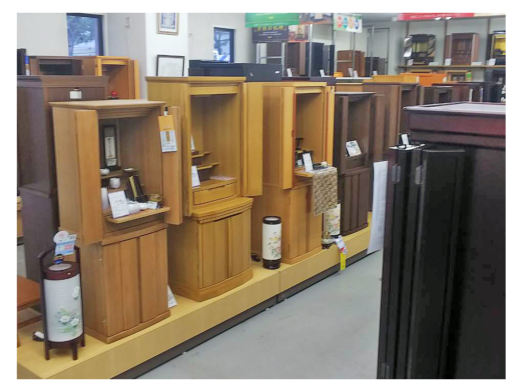 尼崎店では金箔仏壇・唐木仏壇・家具調仏壇などを種類ごとに展示し、お客様にとって見やすく分かりやすい商品ディスプレイを心掛けています。また、宗派別に仏具の飾りつけを行っており、「自宅に安置した仏壇をイメ...