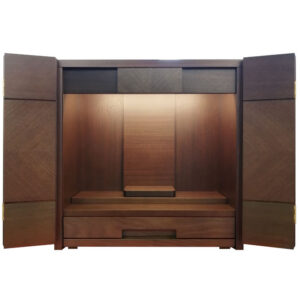 お手頃価格でコンパクトなお仏壇です。ウォールナットの落ち着いた色合いにシンプルなデザインがどのようなシーンにも合わせやすいお仏壇となっております。