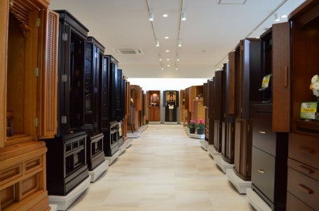 2階には、金仏壇や唐木仏壇など伝統的なお仏壇を豊富にご用意。3階には墓石のショールームを展開しています。