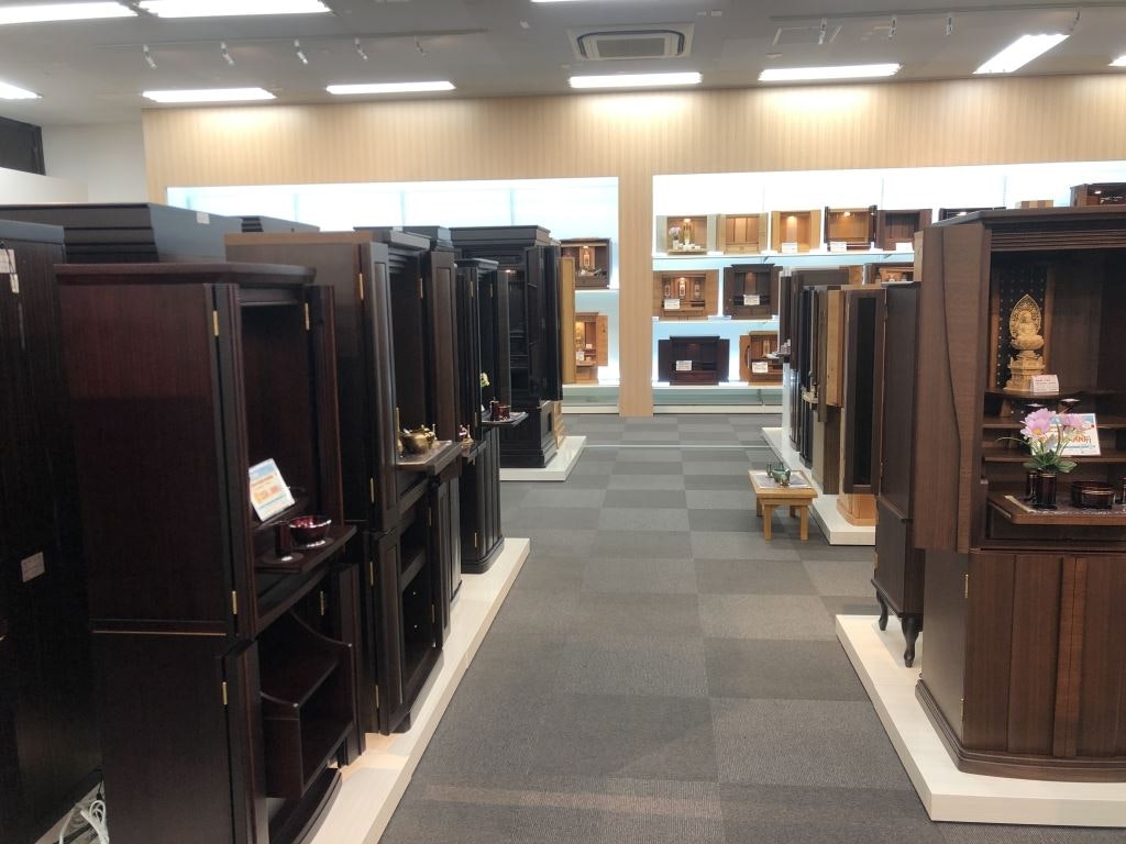 売り場面積は80坪と地域最大級の広さで、ガラス張りの明るくモダンな店内にはリーズナブルな価格から高級品まで常時130本もの仏壇が展示されています。